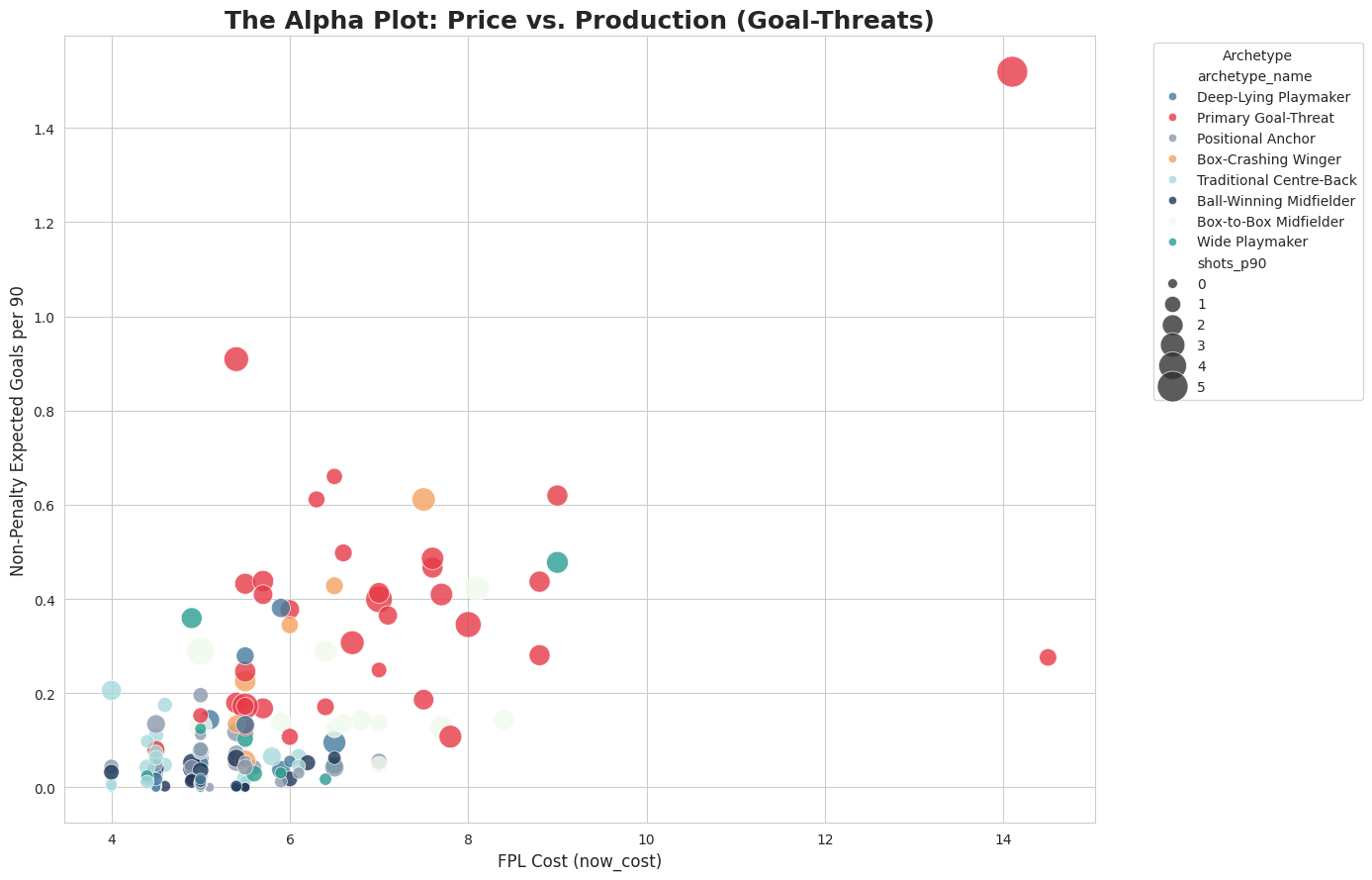 Identifying a player's true role is the first step. The second is mapping that role against their FPL cost to find value. The "Alpha Plot" does exactly this for our most important archetype, the Primary Goal-Threat.