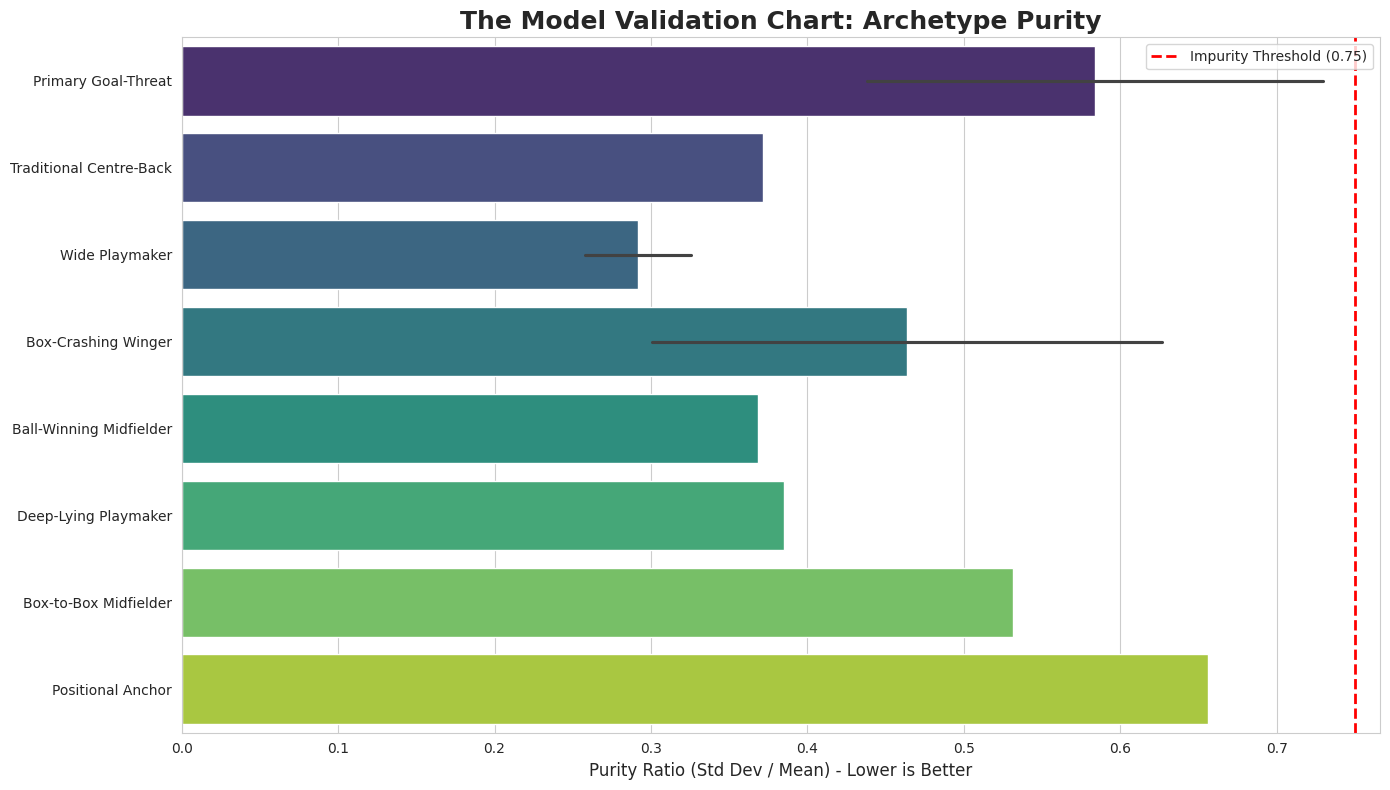 Validation: We did not simply trust the output. We validated it. A Silhouette Score confirmed that eight distinct clusters (K=8) was the most statistically coherent solution. Furthermore, we ran a Purity Report, ensuring that the variance within each archetype was low. As the chart below shows, every single one of our eight archetypes sits comfortably below the 0.75 impurity threshold, confirming they are tight, well-defined player roles, not statistical dumping grounds.
