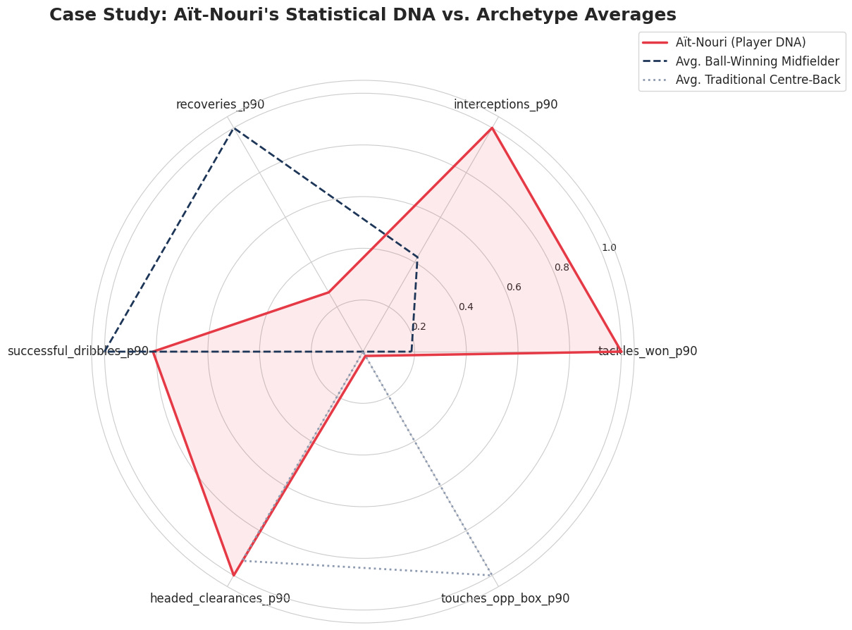 FPL lists him as a Defender. Our model, based on his raw statistical output, unequivocally classifies him as a Ball-Winning Midfielder. The visual evidence is undeniable. When you overlay his personal statistical radar chart against the average profiles of a Defender and a Ball-Winning Midfielder, he is a near-perfect match for the latter. His profile is defined by tackles and interceptions, not the headed clearances of a Traditional Centre-Back.