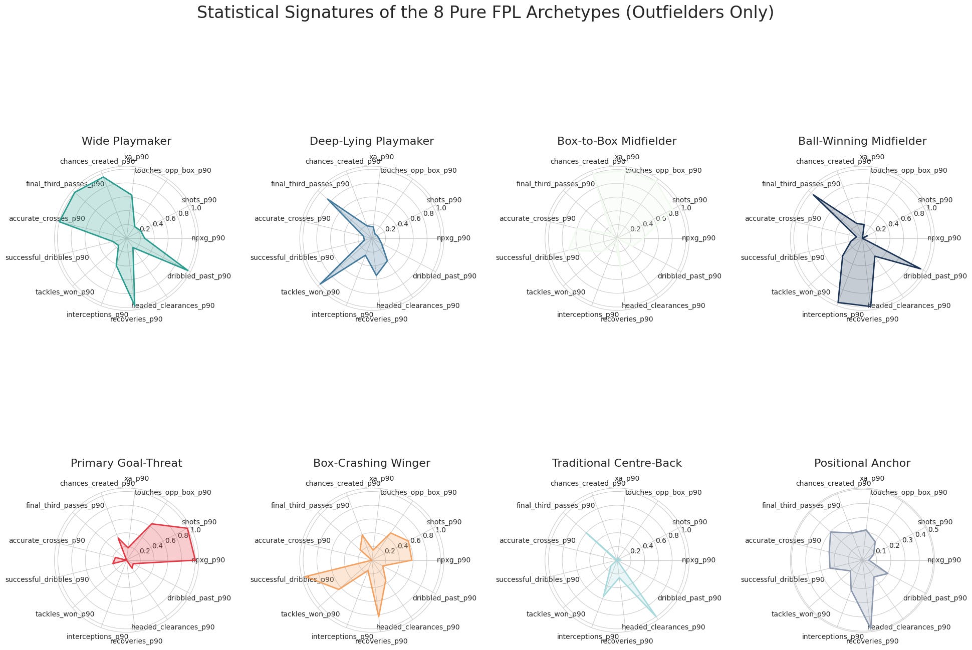 This process revealed eight distinct roles. The radar charts below show the statistical signature of each archetype—its unique fingerprint based on the key metrics that define it.